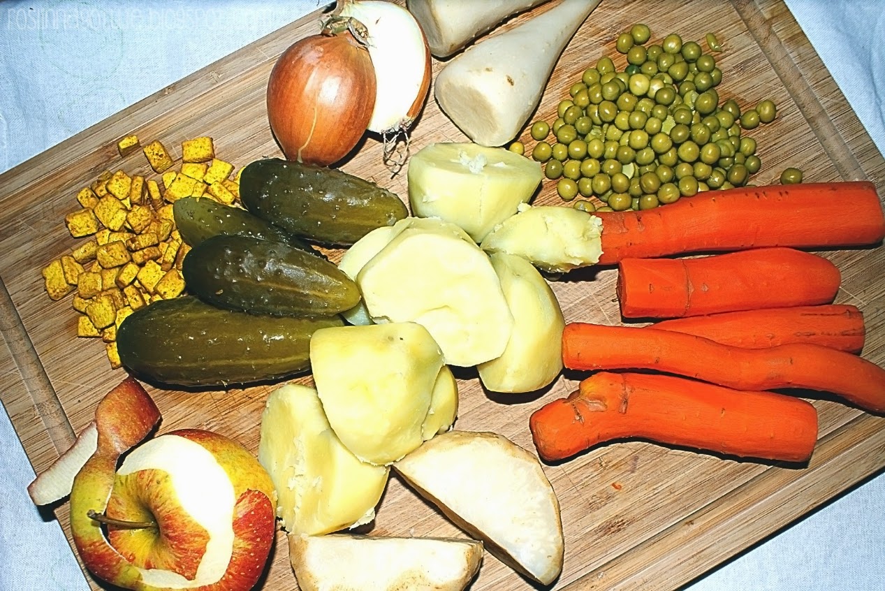 Ziemniaki, marchewki, pietruszkę, seler ugotuj lub upiecz i pozostaw do ostudzenia. Wszystkie pokrój w drobną kosteczkę.